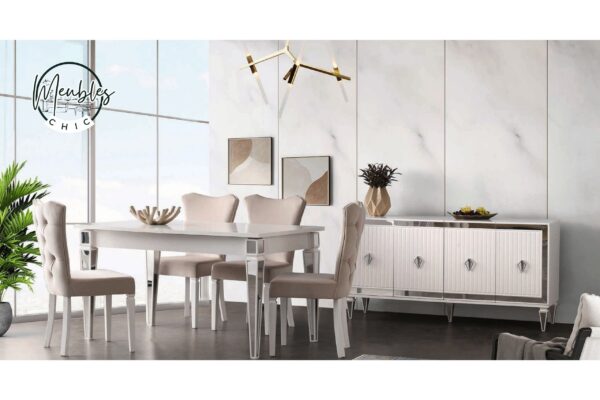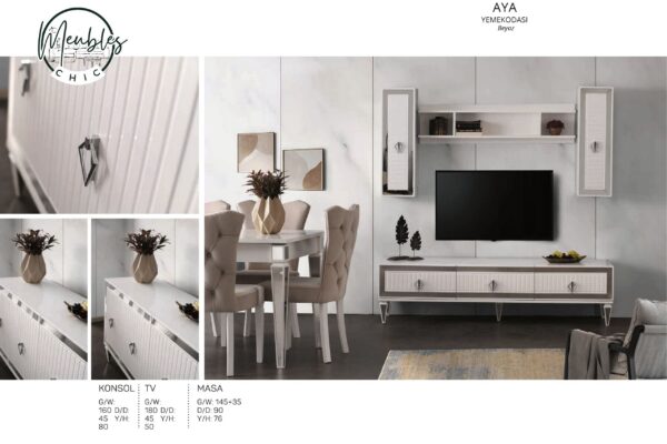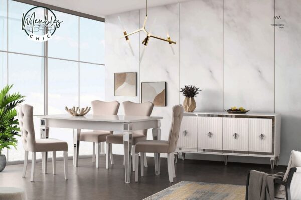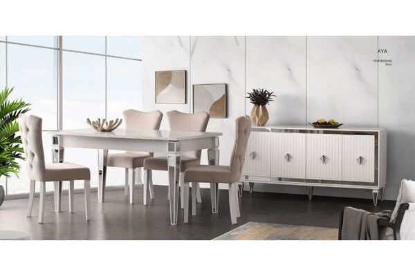 La salle à manger AYA Beyaz se distingue par son design moderne, épuré et extrêmement lumineux.