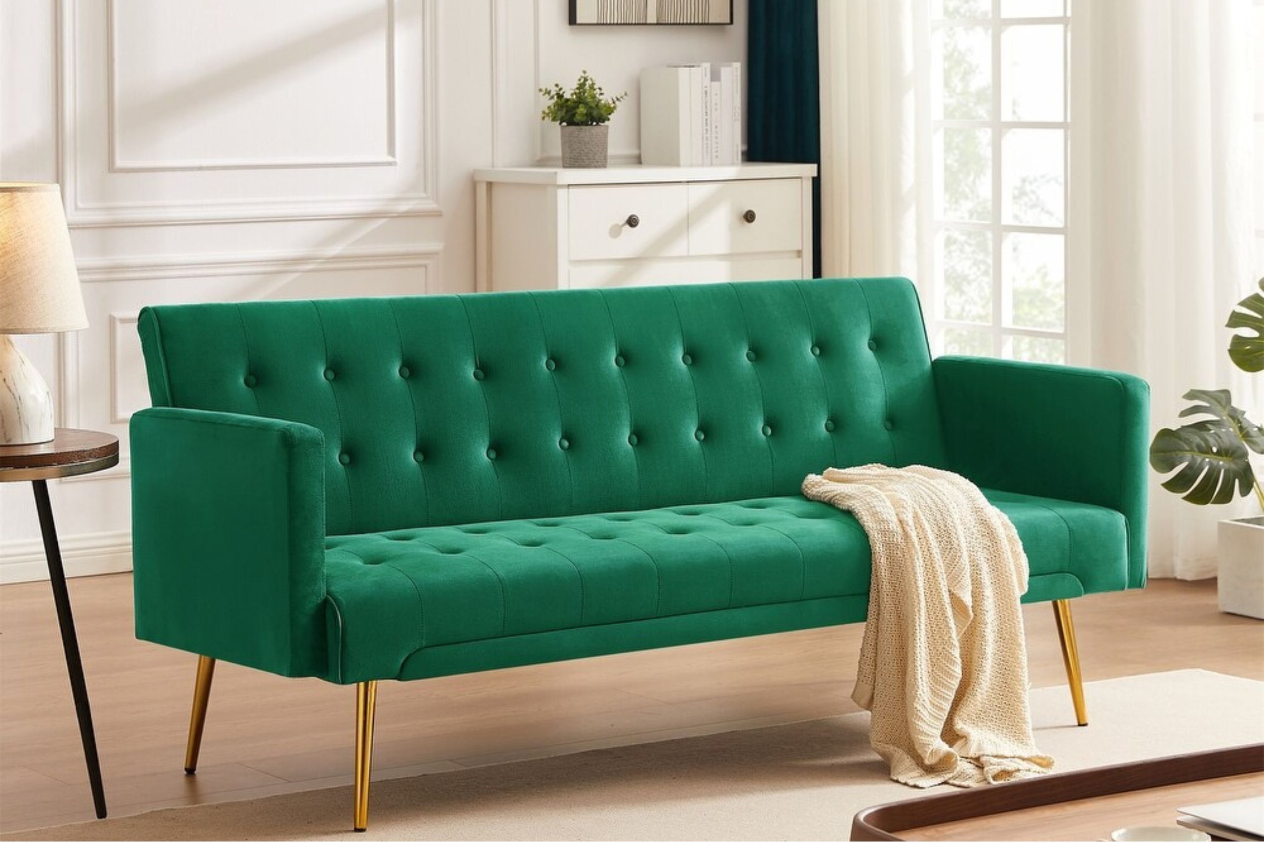 Le canapé AYAN incarne l’élégance moderne avec son revêtement en velours vert sapin capitonné et son design inspiré de l’art déco. Convertible grâce à son mécanisme clic-clac, il se transforme en lit d’appoint confortable pour deux personnes, parfait pour recevoir vos invités en toute simplicité.