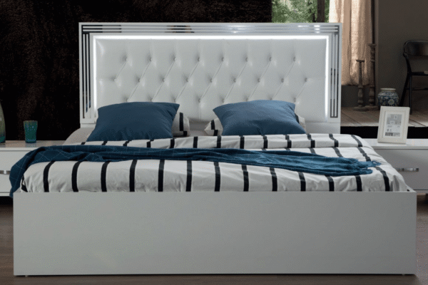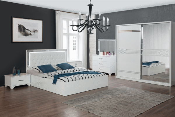 Illuminez votre chambre avec notre modèle complet Star composée d’un cadre de lit, d’une armoire, de deux chevets et d’une commode avec miroir.