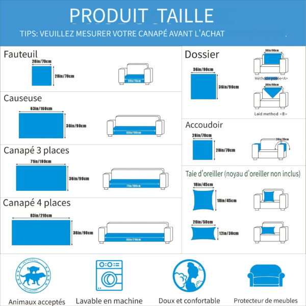 | Dimension | Fauteuil 71, 12cm×71, 12cm, Causeuse 91, 44 Cm × 160, 02 Cm, 3 Places 91, 44 Cm × 180, 34 Cm, 4 Places 91, 44 Cm × 210, 82 Cm, Accoudoir 71.12cm×71.12cm, Dossier 91, 44 Cm × 91, 44 Cm, Taie D'oreiller 45, 72 Cm × 45, 72 Cm |