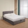 Ce lit double est Ă©quipĂ© d’un sommier coffre novateur offrant un espace de rangement discret et spacieux.