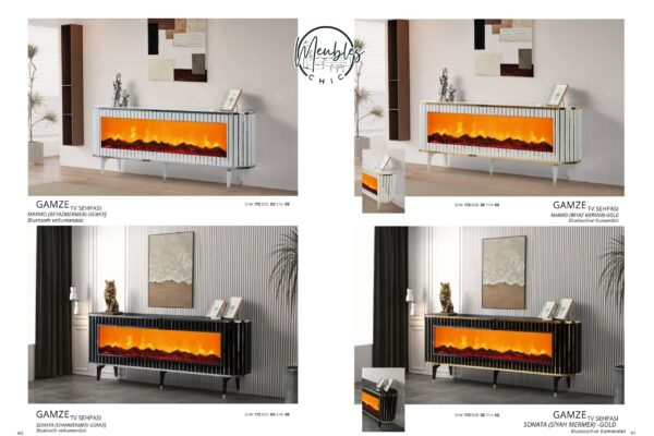 Un meuble TV moderne et décoratif avec cheminée intégrée, souvent appelé Gamze TV sehpası dans les catalogues de meubles turcs :