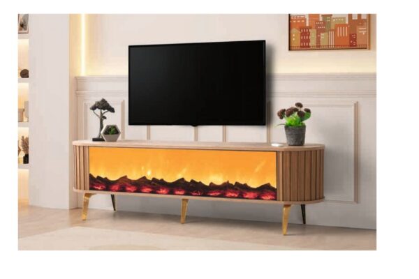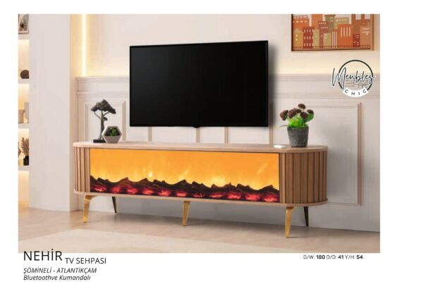 ⭐ Bera Marmo – Meuble TV Nehir avec cheminée (Gold)