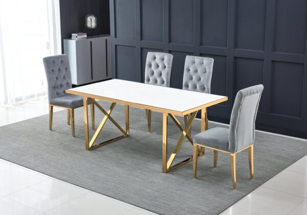 Élégante et sophistiquée, la Table à Manger CLARA associe une surface en verre trempé blanc à des accents dorés raffinés. Son design intemporel s’intègre harmonieusement à tous les styles de décoration, du moderne au classique, en apportant une touche de luxe et de charme à votre espace repas.