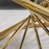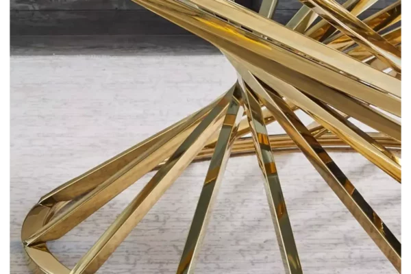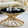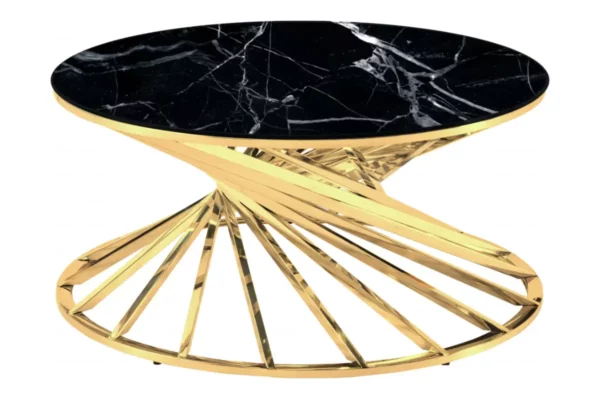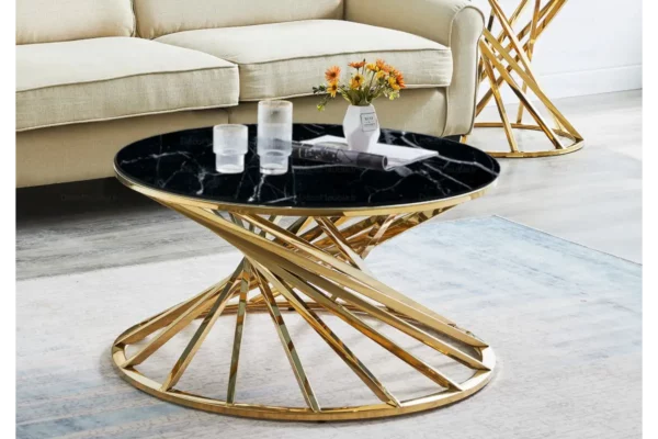 La Table Basse Ronde RUBY séduit par son plateau en verre trempé effet marbre noir et son pied en métal doré. À la fois élégante et robuste, elle apporte une touche sophistiquée et personnalisable à tout salon contemporain.
