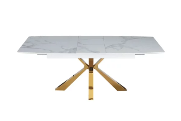La Table Extensible Bianca allie luxe et fonctionnalité avec son plateau en marbre blanc raffiné et ses pieds dorés élégants. Son design moderne et sa capacité extensible en font un choix parfait pour sublimer votre salle à manger tout en s’adaptant à vos besoins.